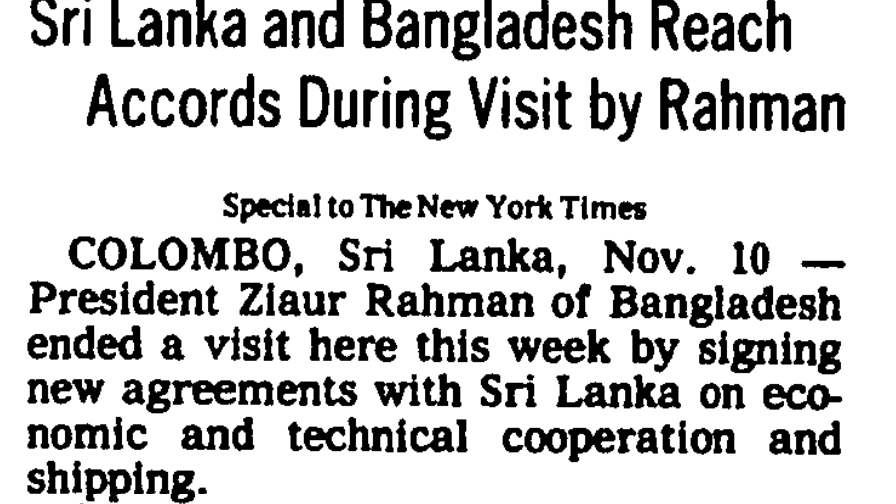 The New York Times (November 11, 1979) President Ziaur Rahman of Bangladesh ended a visit here this week by signing