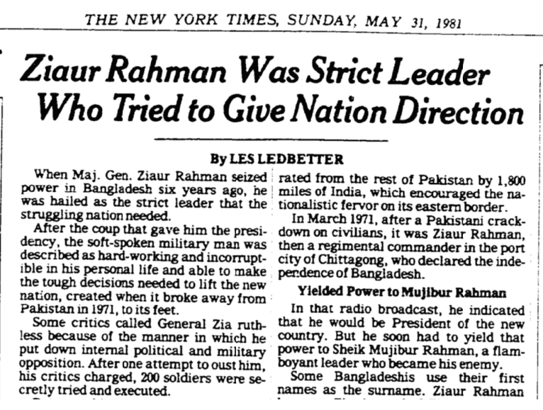 Les Ledbetter, The New York Times (May 31, 1981) When Maj. Gen. Ziaur Rahman seized power in Bangladesh six years