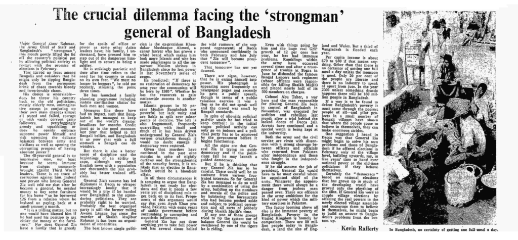 Major General Ziaur Rahman, the Army Chief of Staff and Bangladesh’s “strongman”, this month gently lifted the lid off the country’s political pot by allowing political activity to restart with the promise of elections in February.